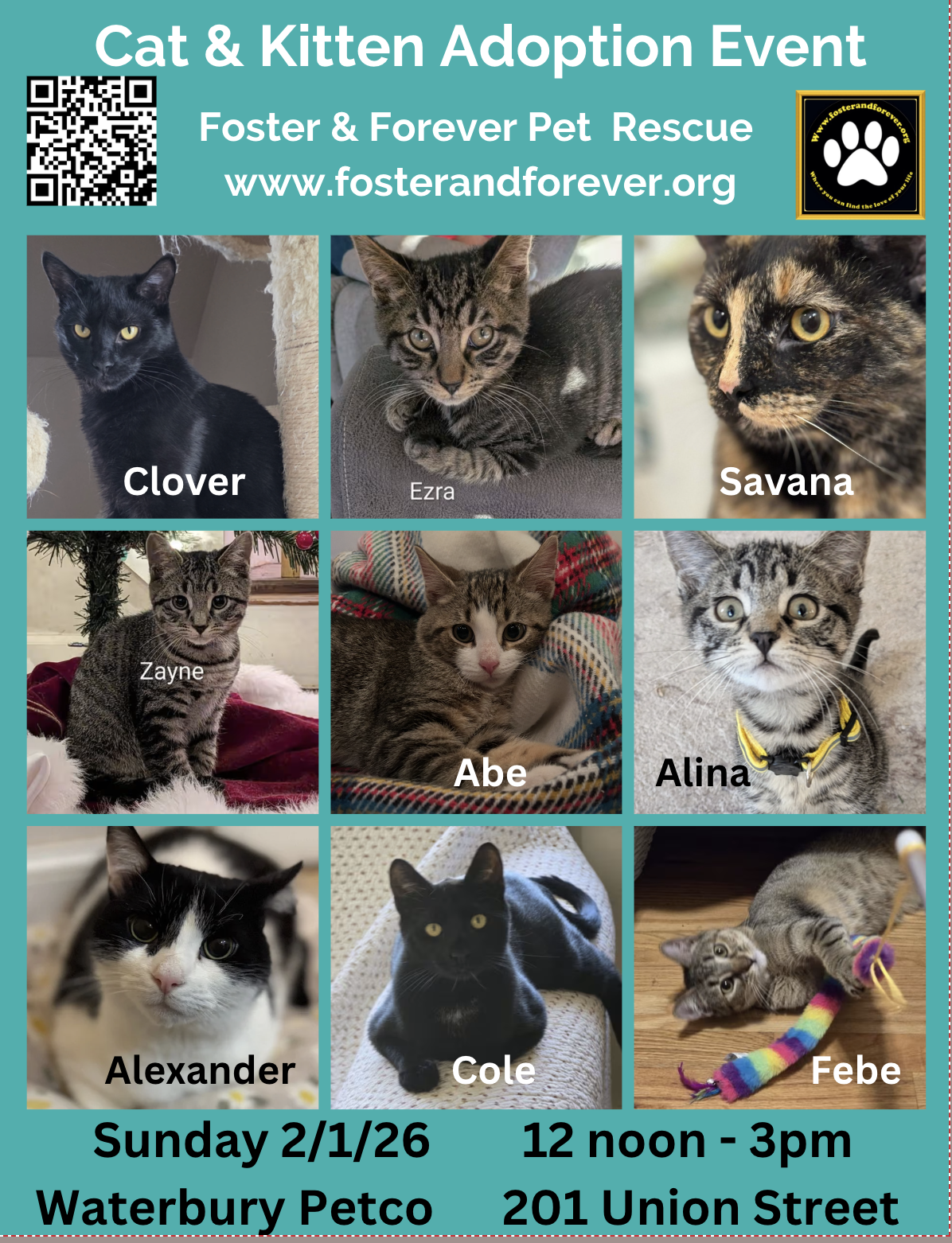 Alexander was born around August 17, 2024, and is currently being fostered in Waterbury. He is fixed, up-to-date on shots, and has tested negative for FIV/FeLV. All of our cats and kittens are cared for in loving foster homes. “Meet and Greets” can be arranged only after an application has been submitted and approved. Applications for adoption can be found at our website at www.fosterandforever.org. Our volunteers do their best to respond within 24-48 hours.